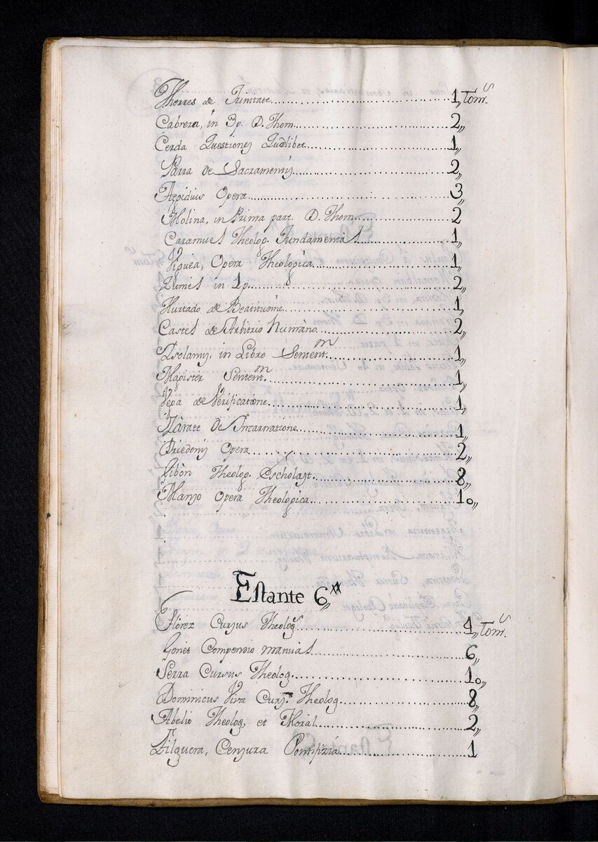 - On Shelf 1, there are significant contributions from Suarez with 17 volumes, followed by Vazquez (6), Valencia (5), and Mastrio (4). Shelf 2 contains works by Gavarsus ("Scola Aegidiarra," 6 volumes) and Gonet (5 volumes), with additional titles from authors like Salanco and Joanes a S. Thomas, among others, accumulating a total of 19 works. Shelf 3 features various authors, including Becano and Esparra, each with 2 volumes, alongside larger collections such as Piscinardo (3 volumes) and Bañez (3 volumes). Shelf 4 highlights theological contributions from authors like Paulus a Concepcióne (4 volumes) and Montalbán (4 volumes), as well as works addressing the teachings of St. Thomas. Shelf 5 includes individual texts from Torres, Cabrera, and Aegidius, among others, providing insights into sacraments, human will, and beatitude. Finally, Shelf 6 presents a mixture of theological courses and compilations, featuring works from Gonet, Serra, and Dominicus, with various theological reflections and studies on virtues. This text is in the volume of the Inventarium Generale Omnium Librorum huius Bibliothecae Conventus Divi Pauli Manilensis Ord. Eremitarum S.P.N. August. In hac Provintia SS Nominis JESU Philipinarum." 1762.
