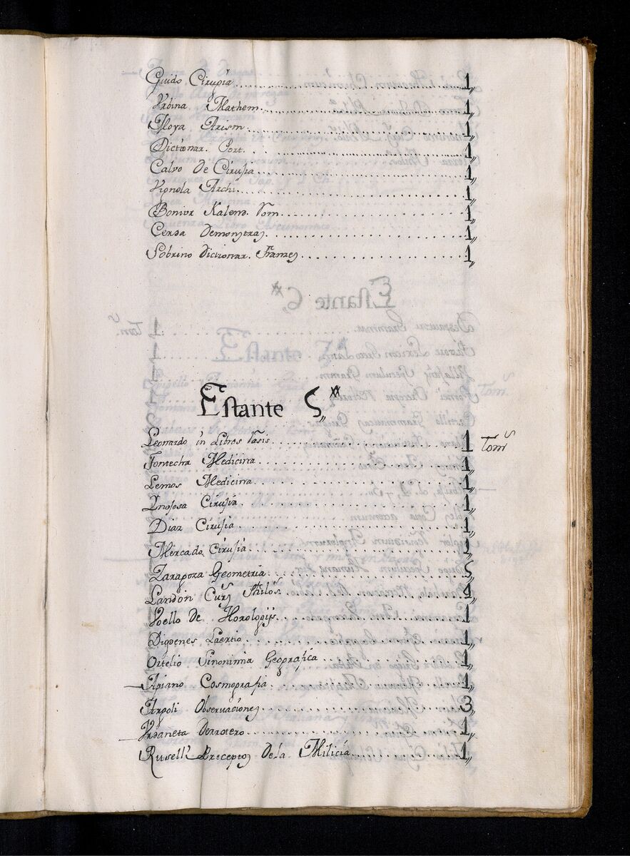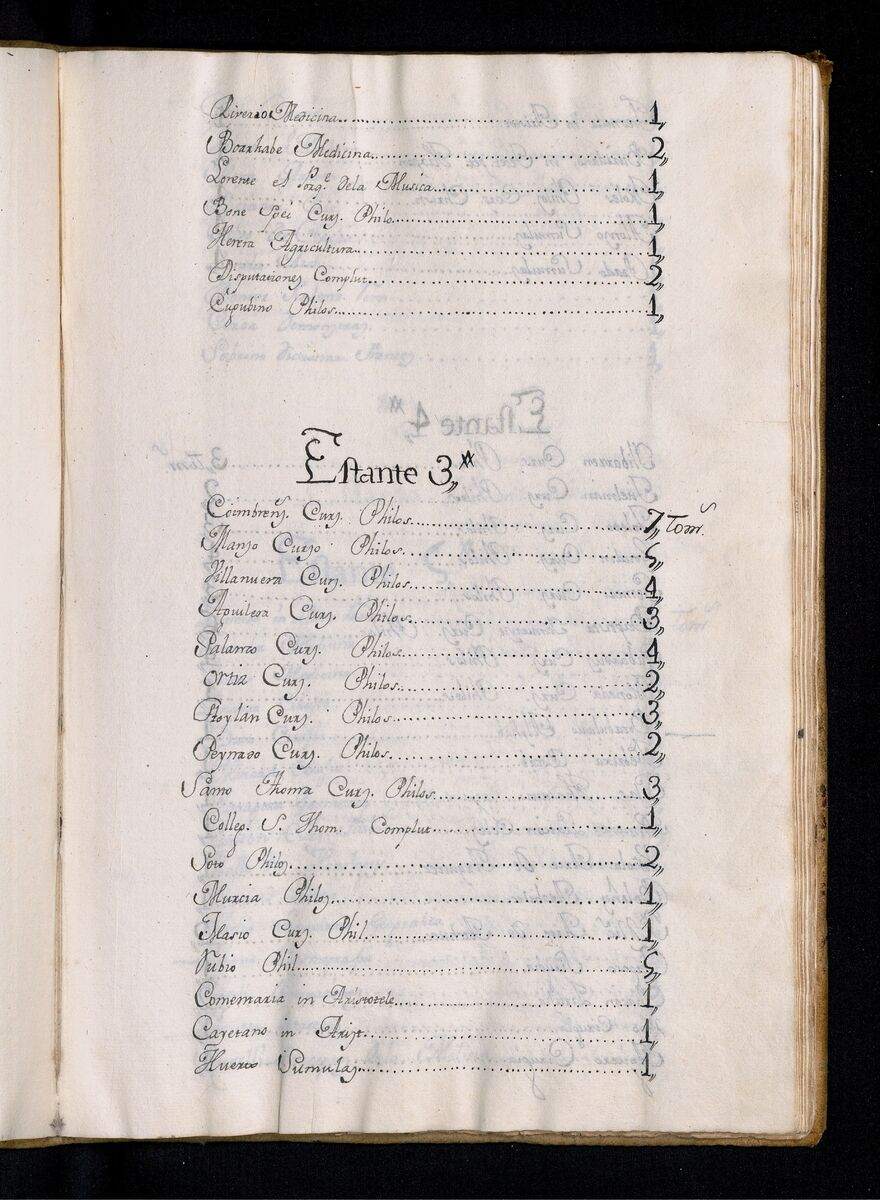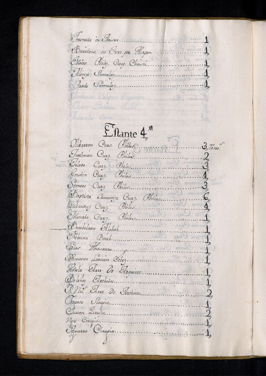 - Shelf 1 features writings such as "De Peces y Aves" by Carnado, along with contributions from Quinquenius and Hevelio, covering topics from philosophy to natural sciences. Shelf 2 includes texts on philosophy and ethics by Drophanes and Cavio, as well as writings on medicine and music. Shelf 3 highlights various philosophical courses from multiple authors, showcasing a spectrum of thought and inquiry. On Shelf 4, additional philosophical texts are found alongside vocabulary and architectural treatises, alongside works related to surgery and mathematics. Shelf 5 comprises medical writings and geometry texts, while Shelf 6 features grammar, rhetoric, and linguistics, providing comprehensive resources for linguistic studies. Lastly, Shelf 7 presents anatomical studies, astronomical works, and a significant collection of vocabularies in various languages, including tagalog and Italian grammar. This text is in the volume of the Inventarium Generale Omnium Librorum huius Bibliothecae Conventus Divi Pauli Manilensis Ord. Eremitarum S.P.N. August. In hac Provintia SS Nominis JESU Philipinarum." 1762.
