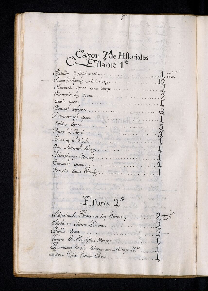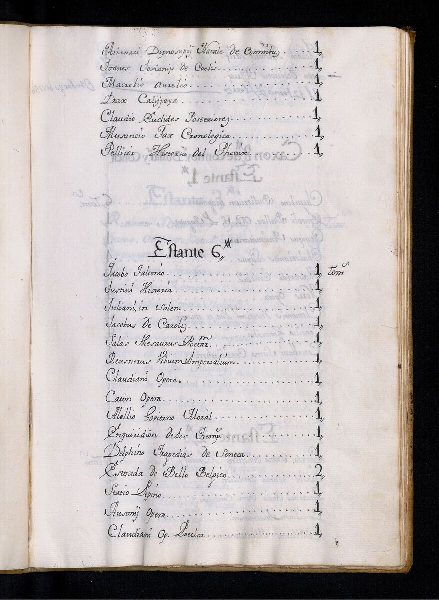- Shelf 1 contains notable titles such as Mabillon's "De Rediplomatica," Enriquez's "Hortus Malabanicus" in twelve volumes, and various classical works by authors like Plutarch, Ovid, and Aristotle. Shelf 2 features eight volumes of Beyerlinck's "Theatrum Vitae Humanae," along with writings on poetry, Roman history, and genealogies. Shelf 3 includes historical accounts such as Raderio's "Historia de Alexandro Magno" and various reports on the wars in Flanders and the Americas. Shelf 4 showcases works by Justo Lipsio and Guevara, along with classical authors like Julio Cesar and several historical analyses. Shelf 5 features various philosophical and political works, including those by Scotto and Vasco, with topics ranging from poetry to moral governance. Shelf 6 concludes with historical texts, tragedies by Seneca, and descriptions of regions, providing a rich tapestry of knowledge spanning literature, history, philosophy, and more. This text is in the volume of the Inventarium Generale Omnium Librorum huius Bibliothecae Conventus Divi Pauli Manilensis Ord. Eremitarum S.P.N. August. In hac Provintia SS Nominis JESU Philipinarum." 1762.