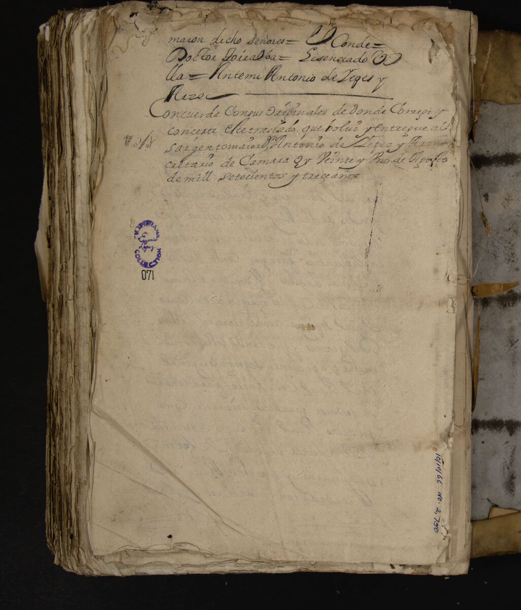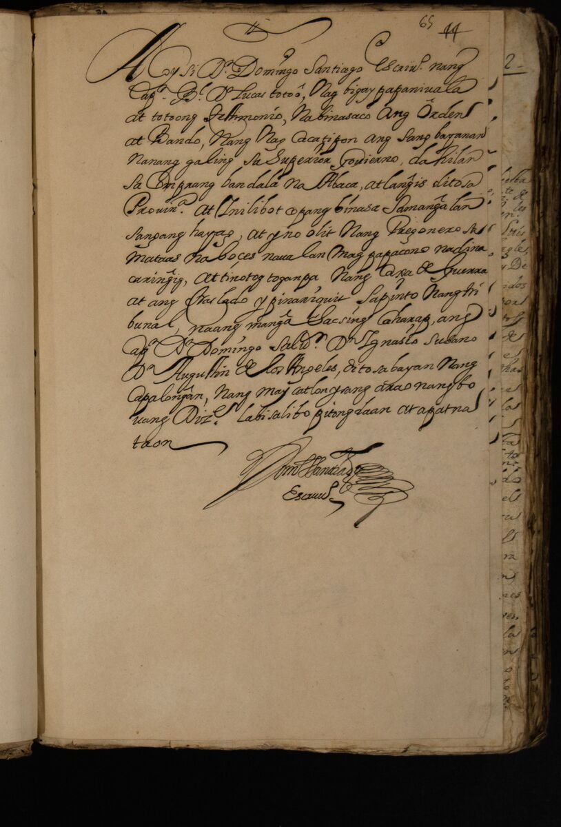 - LMM Accession No. 071;Sotheby 525 [in 7 volumes]. MSS 8484;There are eight indexes in the first section of the legajo, describing its contents. Bikolano and Tagalog documents responding to vandala directives.;The last three folios are loose.