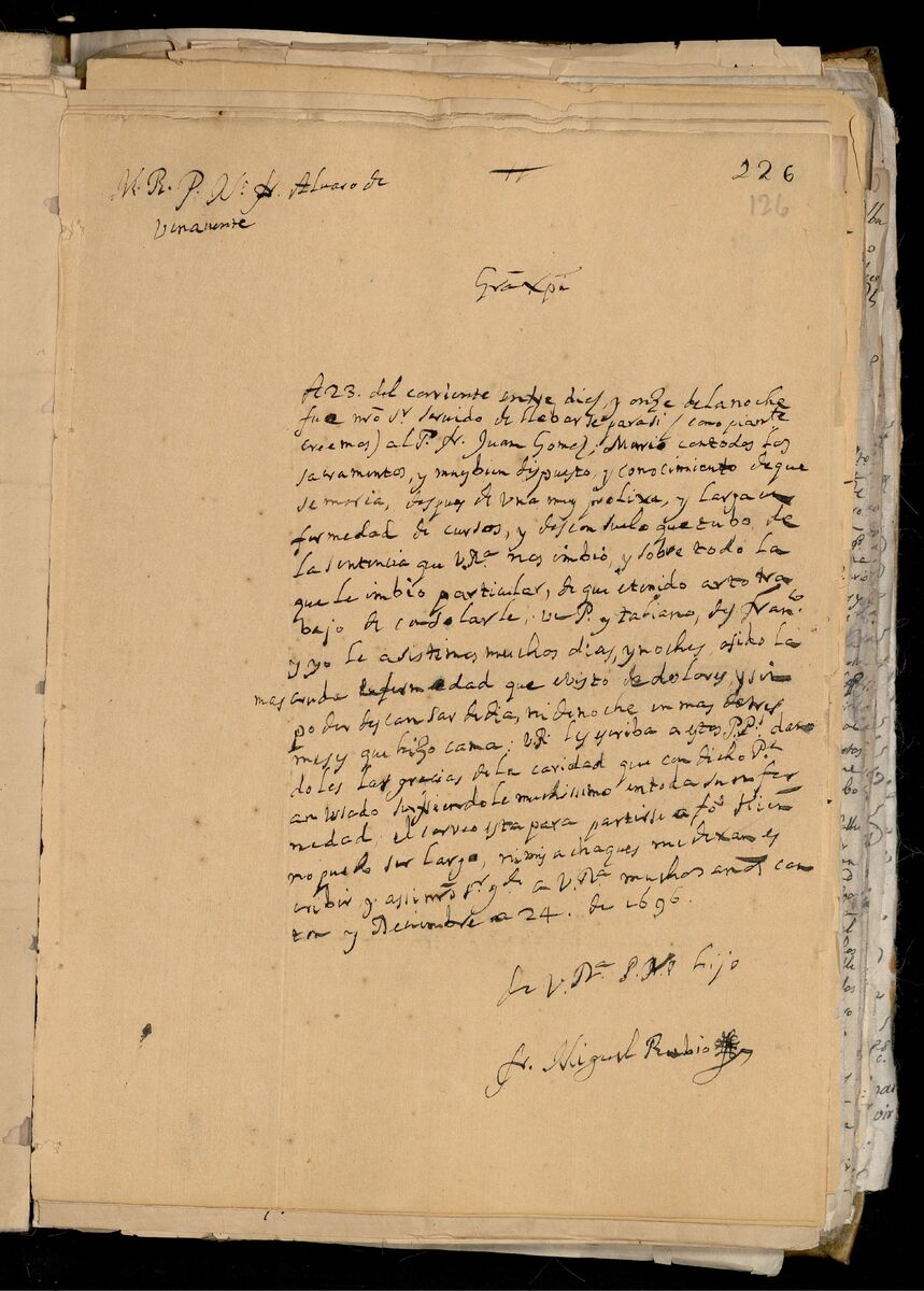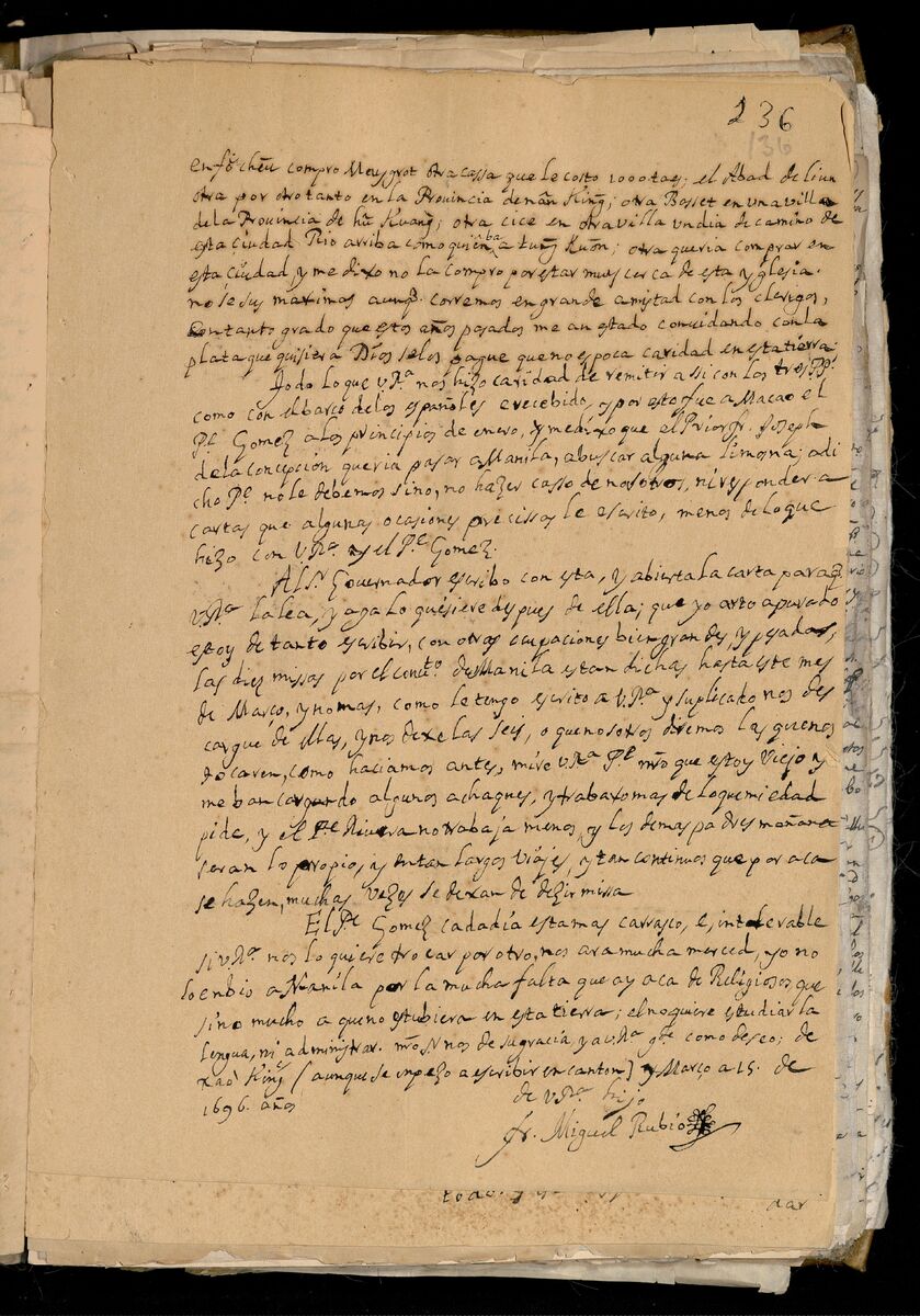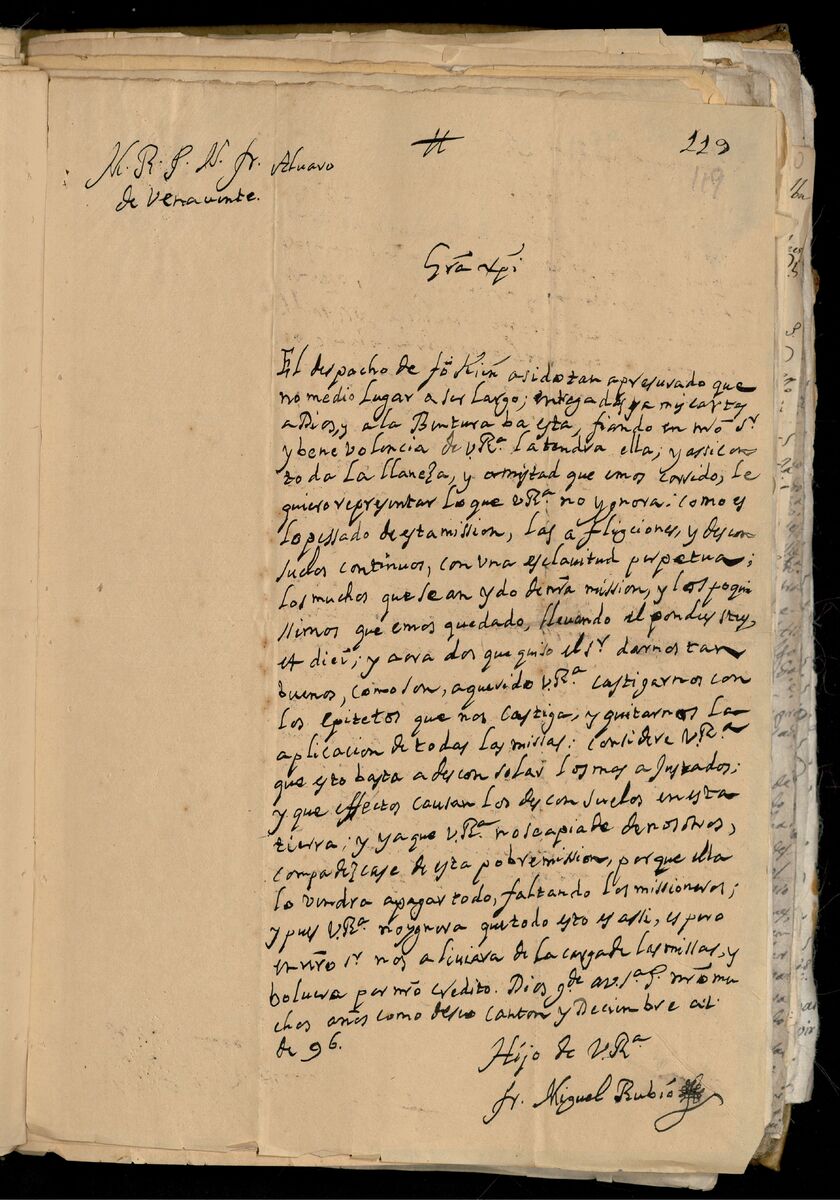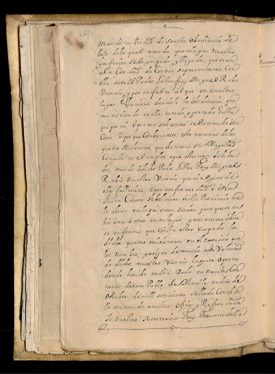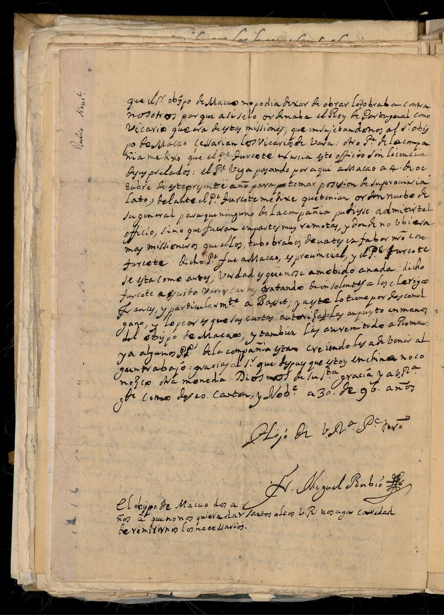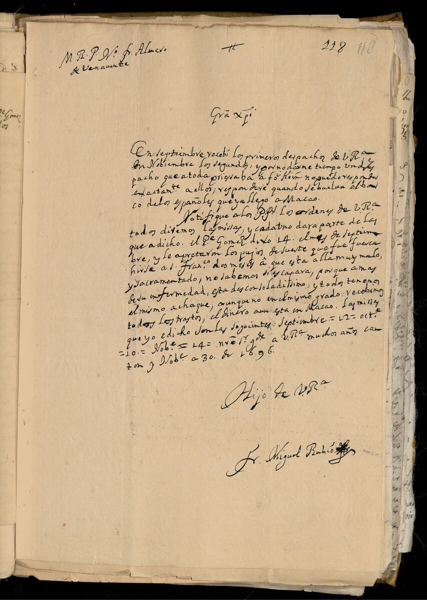 Carta de Fray Miguel Rubio a Fray Álvaro de Benavente, Cantón, 30 de noviembre de 1696