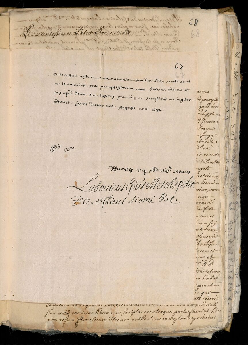 Carta en Latín de Ludovicus Epus Metellopolit, Vicario Apostólico, de Siam, 10 August 1684