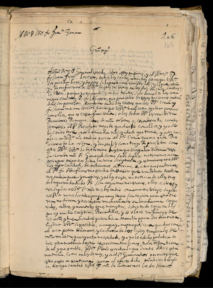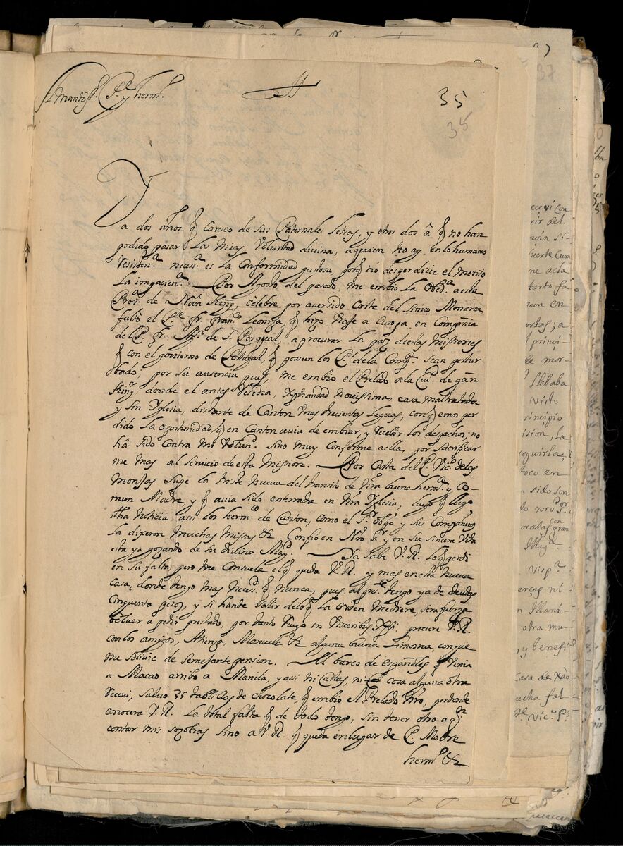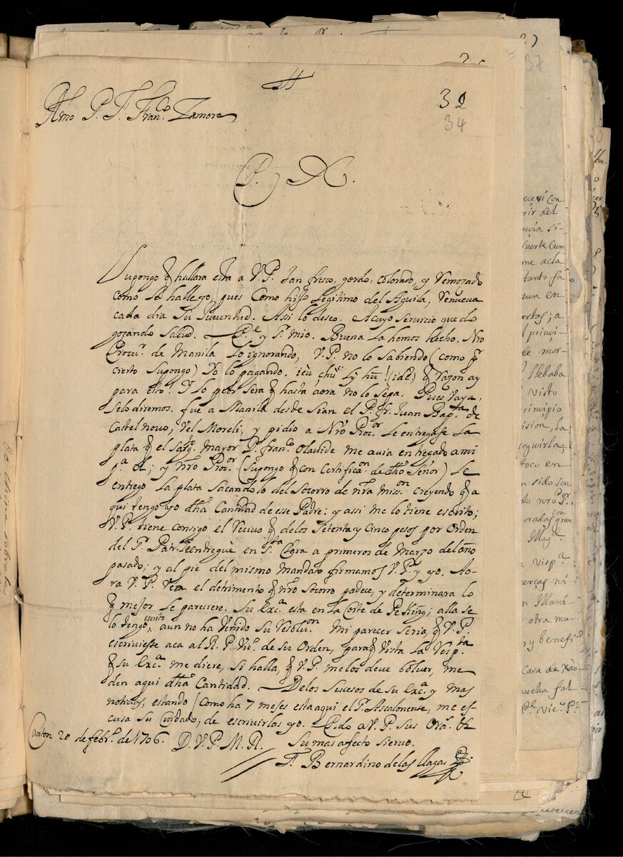 Carta de Fray Bernardino de las Llagas a Fray Francisco de Zamora, de Cantón, 20 February 1706.