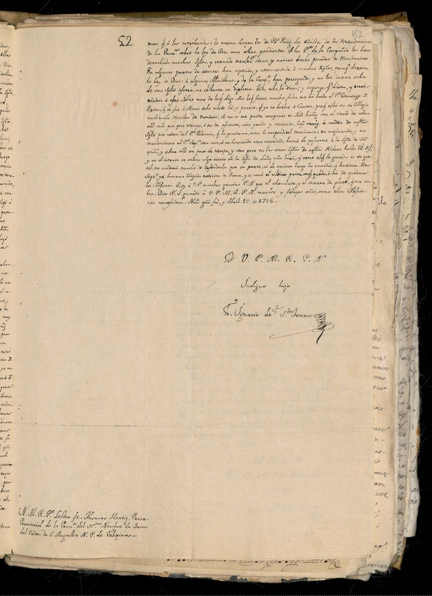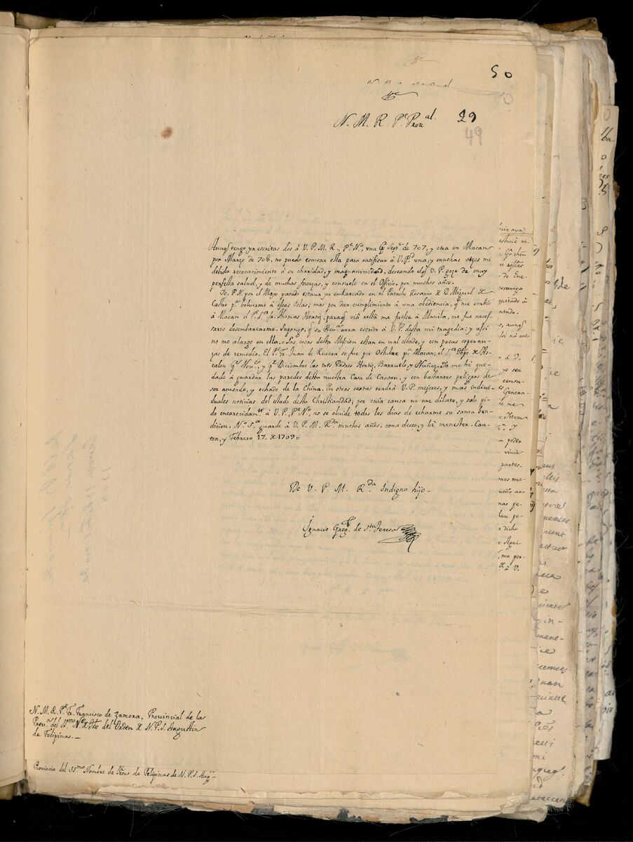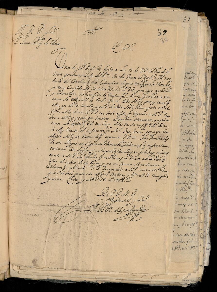 Carta de Fray Bernardino de las Llagas a Fray Juan Baptista de Olarte de Cantón, 24 de abril de 1708
