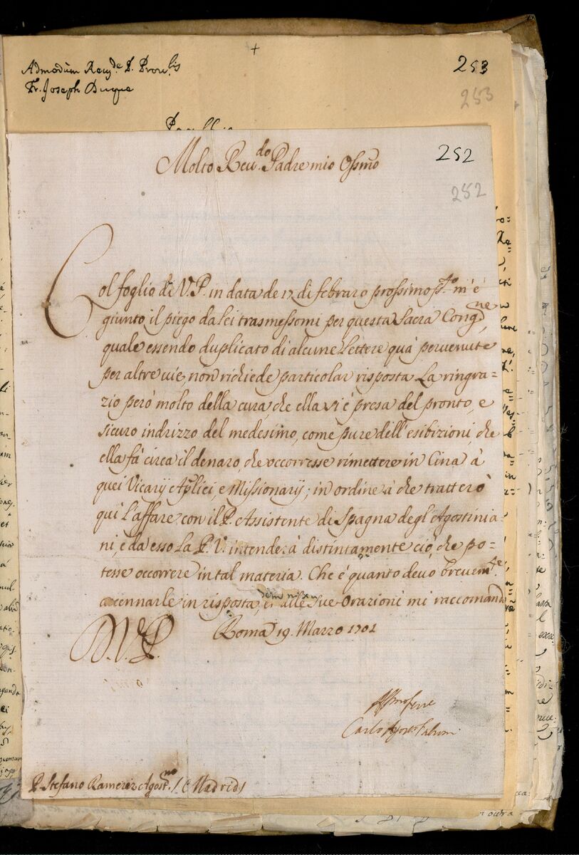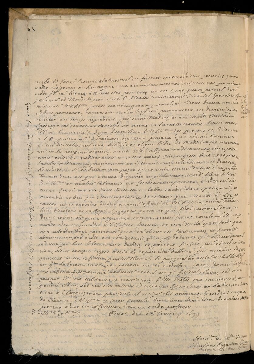Carta de Fray Alonso Domínguez a Fray Esteban Ramírez desde Roma, 20 de marzo de 1701.