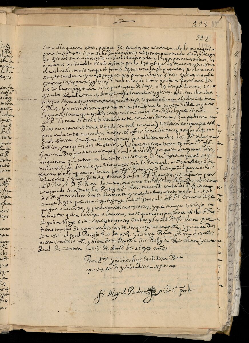 Carta de Fray Miguel Rubio a Fray Francisco de Zamora, de Cantón, 15 de abril de 1699