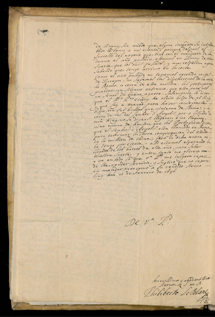 Carta de Fray Philibert Le Blanc al Provincial de Hing-hoa, 10 de febrero de 1696