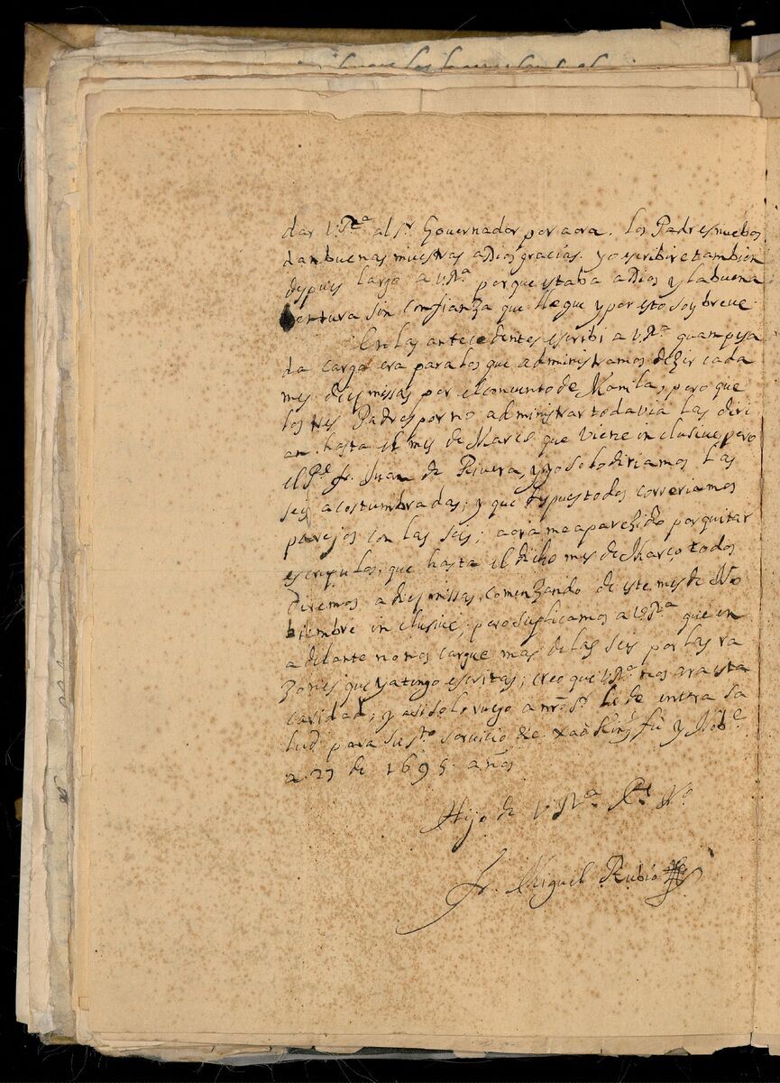 Carta de Juan Nicolás de Rivera a Fray Álvaro de Benavente de Nan-hiung, 2 December 1695