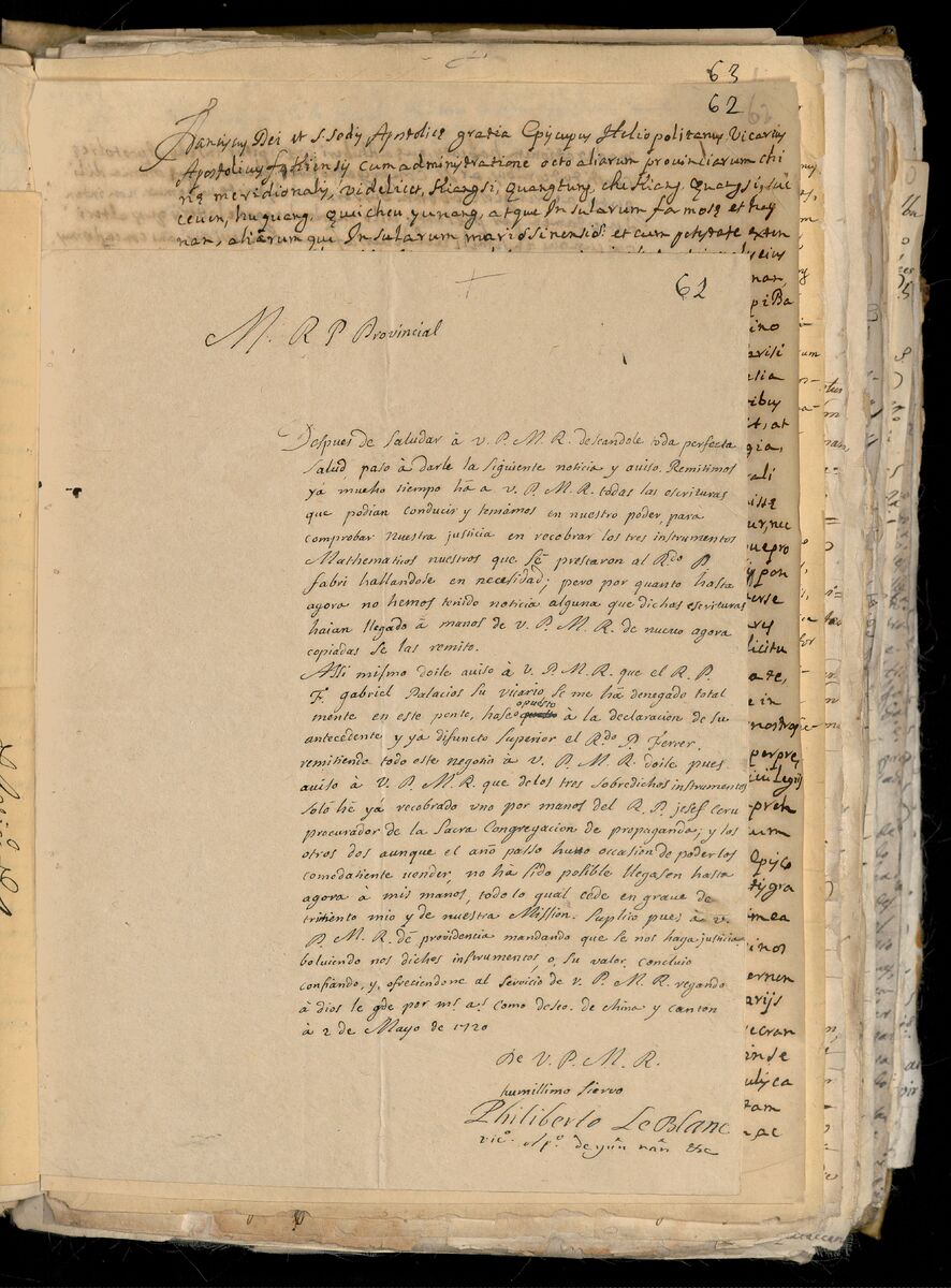 Copia de la carta de Dom Luis de Cice, Vicario Apostólico de Siam y Japón al provincial de Manila, de Siam, 3 de junio de 1717