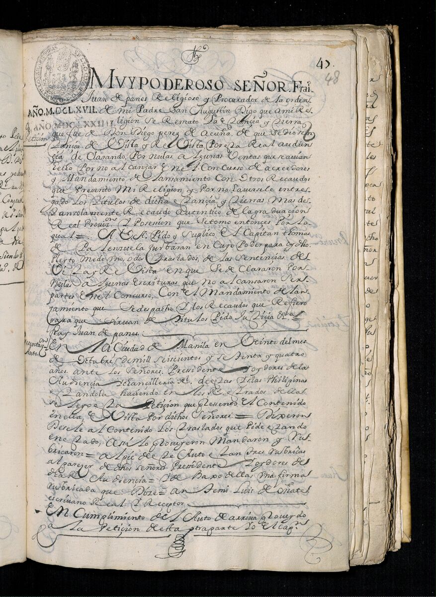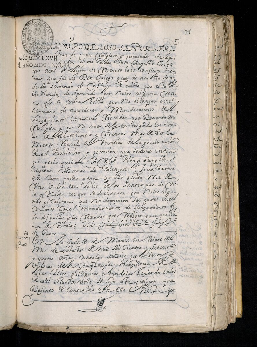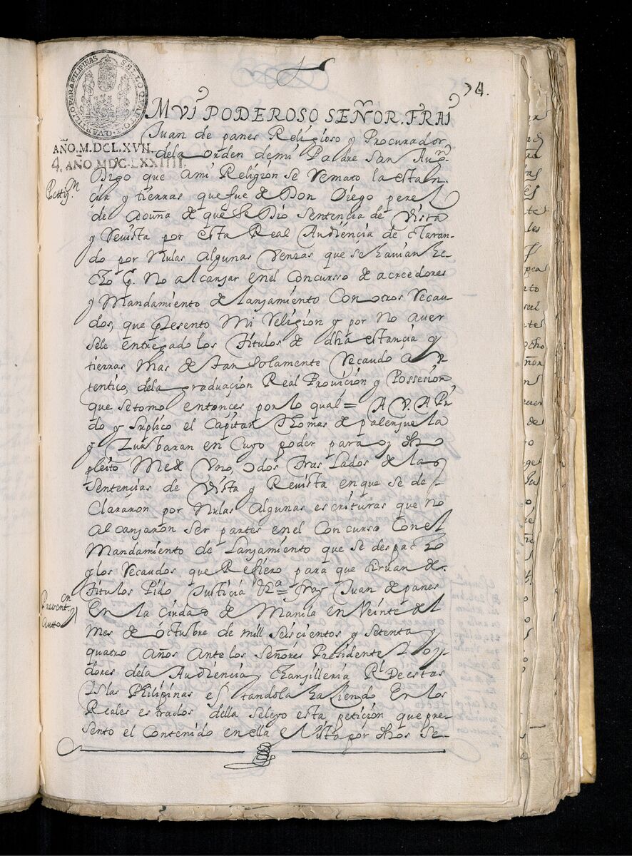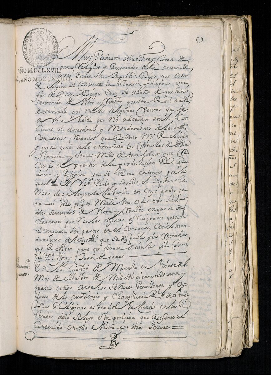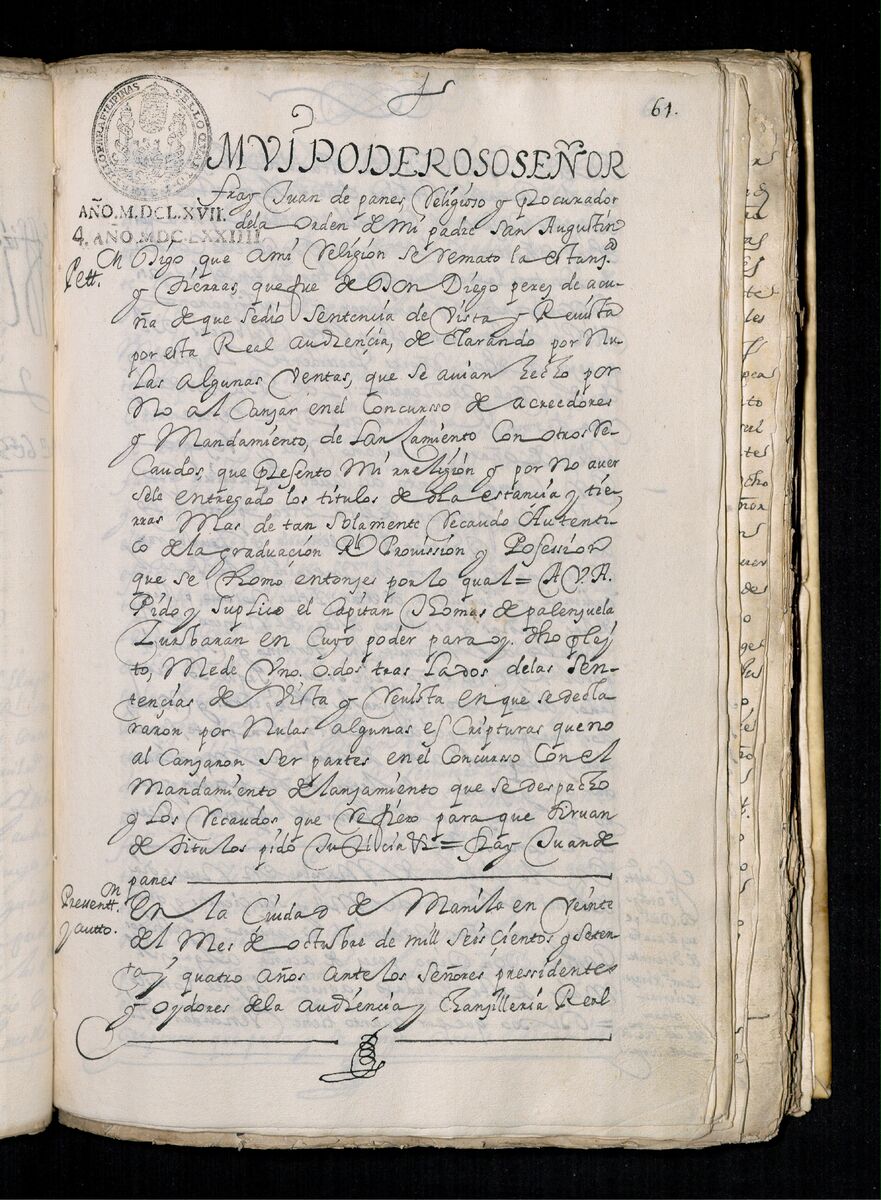 Fray Juan de Panes, Procurador General de la Provincia del Santísimo Nombre de Jesús pide que se les de los traslados de la estancia de Alcina. 1671.