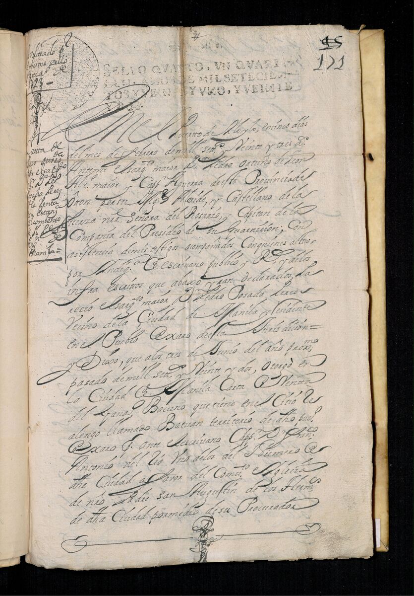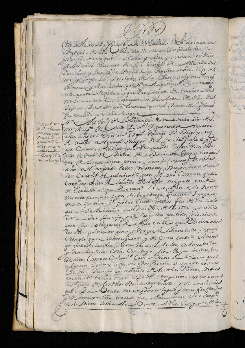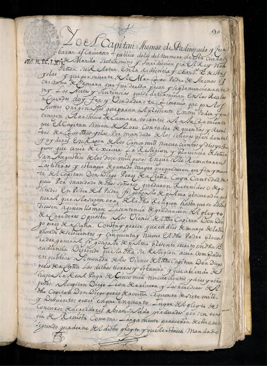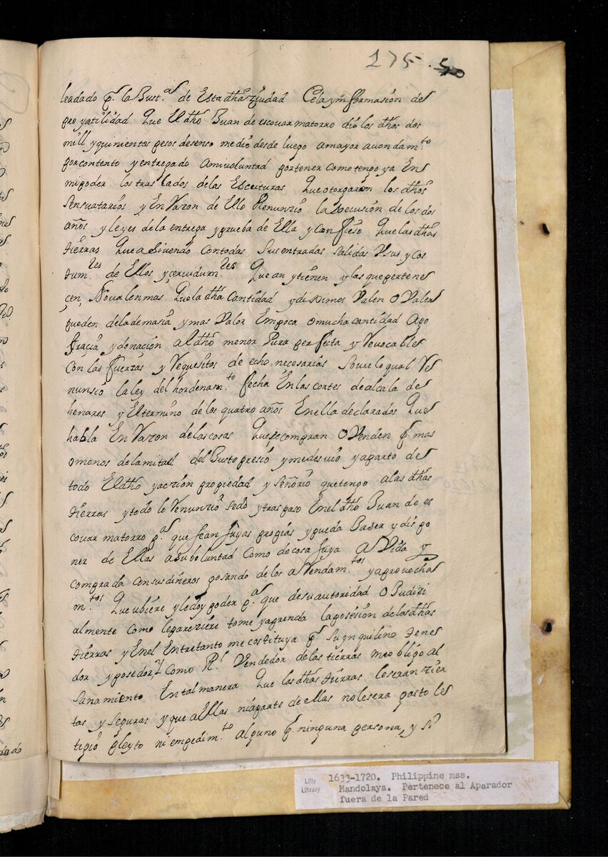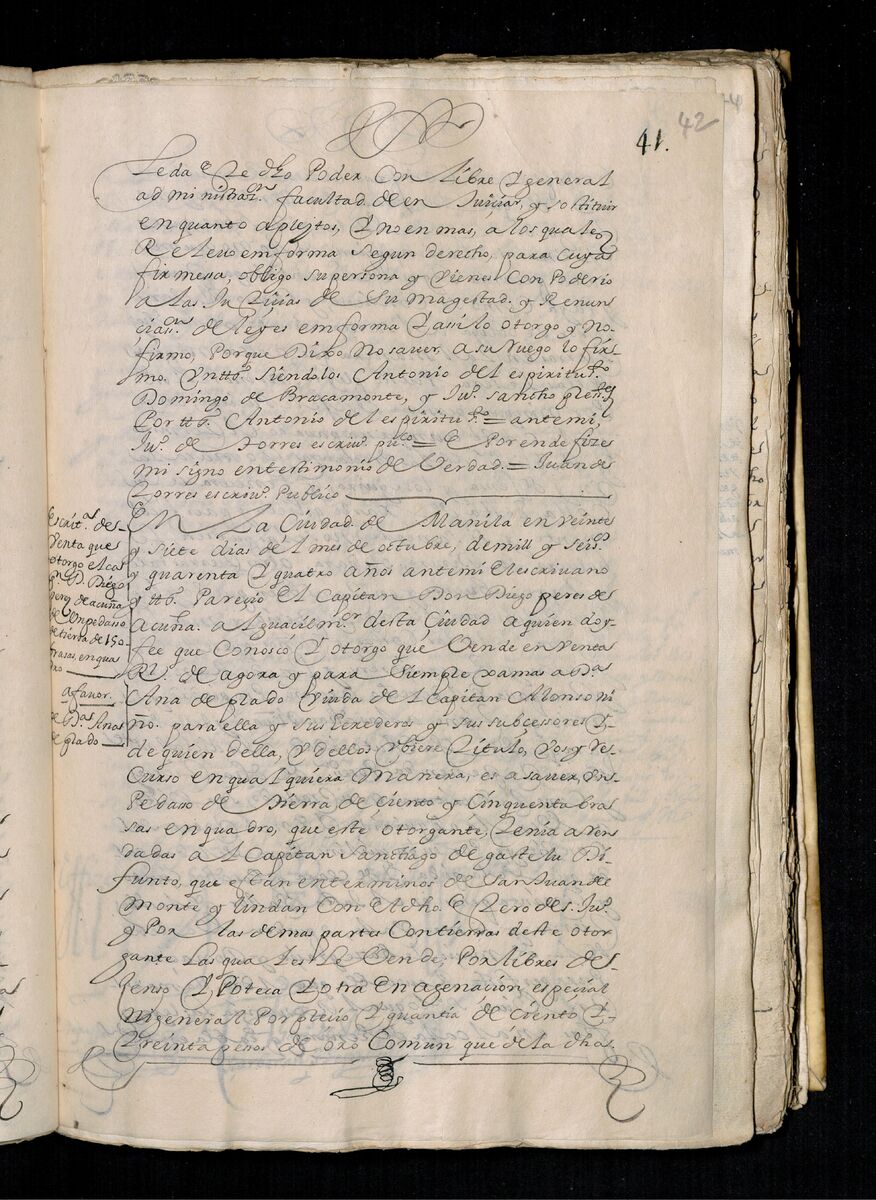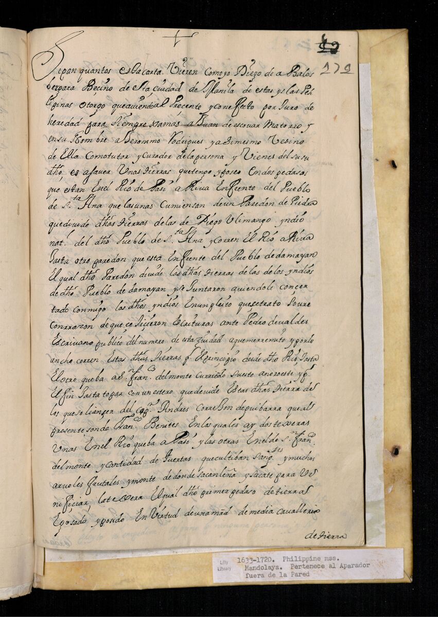 Escritura de venta otorgada por el Sargento Mayor Don Pedro Posada Pérez de una estancia que tiene en el Pueblo de Jaro (Iloilo) al Convento de San Agustín de Manila. 1723.