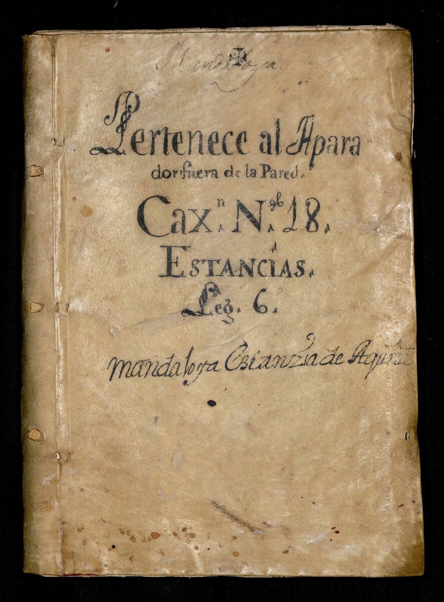 Mandaloya. Pertenece al Aparador fuera de la Pared. Caxon No. 18. Estancias. Legajo 6. Mandaloya y estanzia de Aguna.